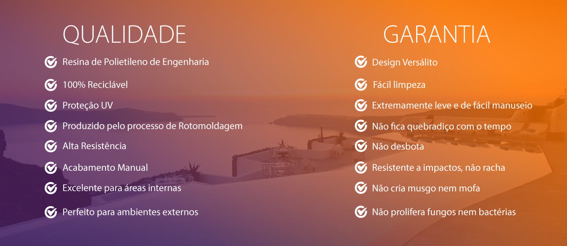 Design produzido pelo processo de rotomoldagem com resina de Polietileno de Engenharia com alta resistência e proteção UV. Mesmo material utilizado em produtos de aplicação especial que exigem resistência, durabilidade e confiabilidade. Além de tudo isso, é um material sustentável 100% reciclável.